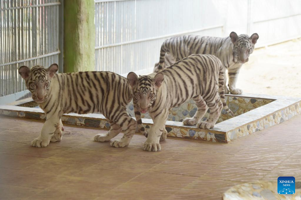 White tiger cubs are seen in Chattogram Zoo in Chattogram, Bangladesh on Nov. 27, 2022. Four white tiger cubs were born at Chattogram Zoo in July. (Xinhua)