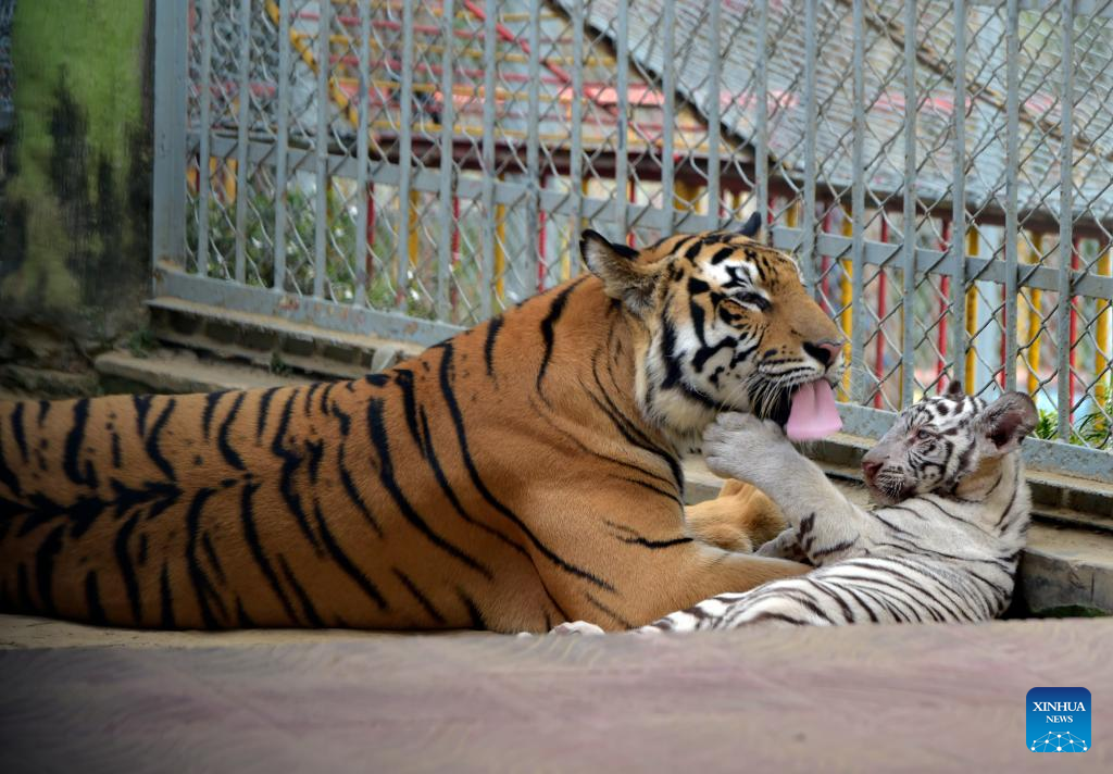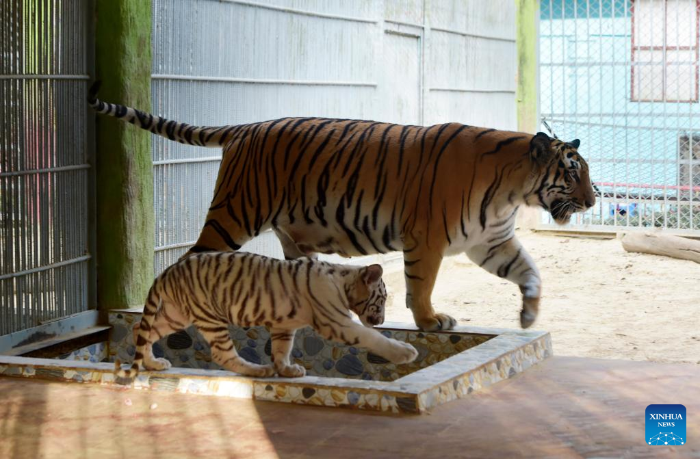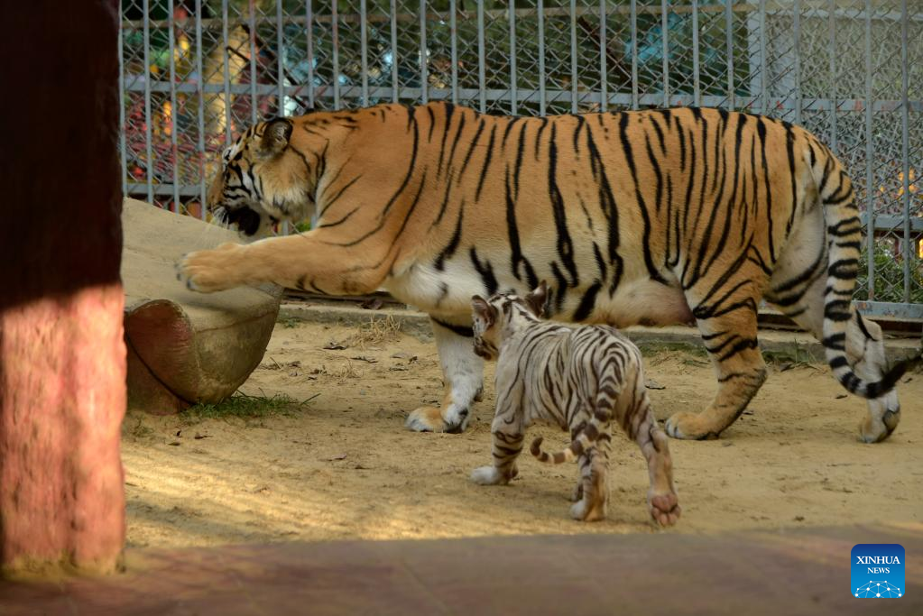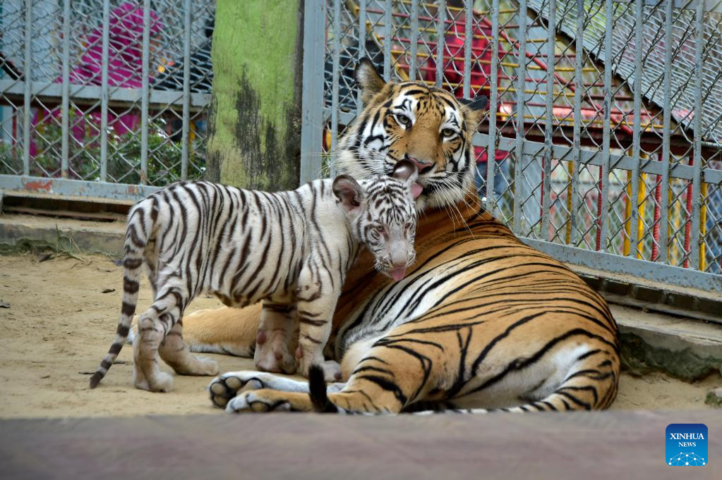 A white tiger cub is seen with its mother in Chattogram Zoo in Chattogram, Bangladesh on Nov. 27, 2022. Four white tiger cubs were born at Chattogram Zoo in July. (Xinhua)