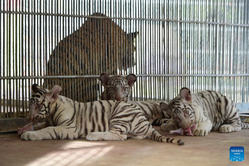 White tiger cubs eat meat in Chattogram Zoo in Chattogram, Bangladesh on Nov. 27, 2022. Four white tiger cubs were born at Chattogram Zoo in July. (Xinhua)