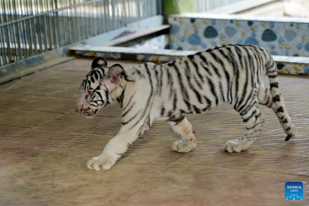 A white tiger cub is seen in Chattogram Zoo in Chattogram, Bangladesh on Nov. 27, 2022. Four white tiger cubs were born at Chattogram Zoo in July. (Xinhua)