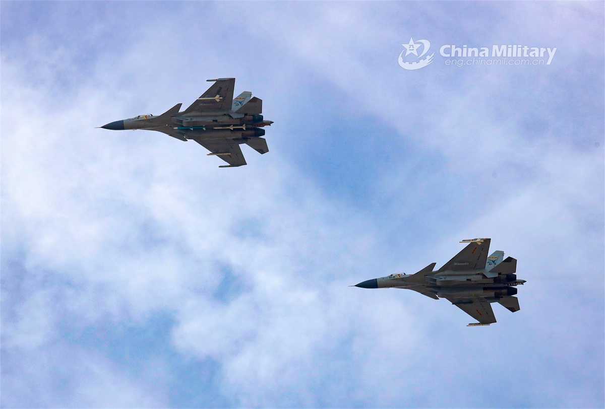 Carrier-based fighter jets attached to a regiment under the PLA Naval Aviation University fly in formation during a real combat flight training exercise on November 16, 2022. (eng.chinamil.com.cn/Photo by Ni Shuai)