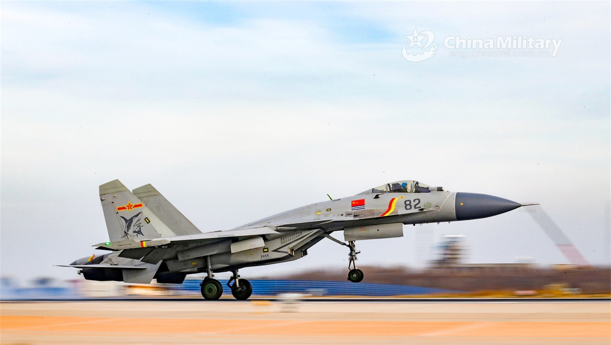 A carrier-based fighter jet attached to a regiment under the PLA Naval Aviation University lands on the runway during a real combat flight training exercise on November 16, 2022. (eng.chinamil.com.cn/Photo by Ni Shuai)