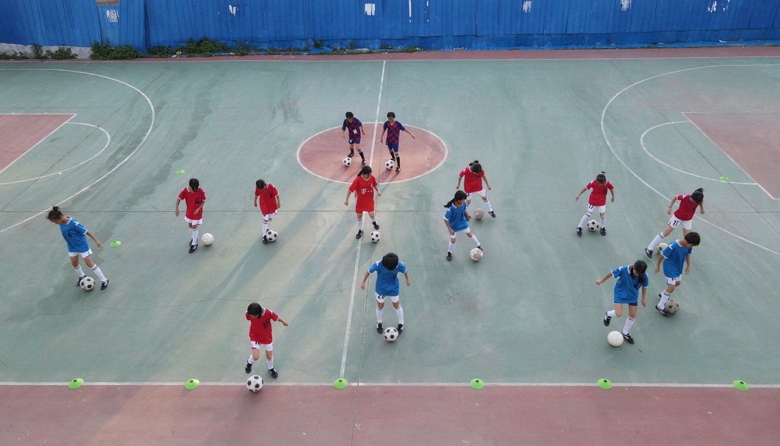 Members of a girls' football team take part in a training session at a nine-year school in Hualan township of Shangsi county, Fangchenggang city, south China's Guangxi Zhuang Autonomous Region. (Xinhua/Huang Yaoteng)