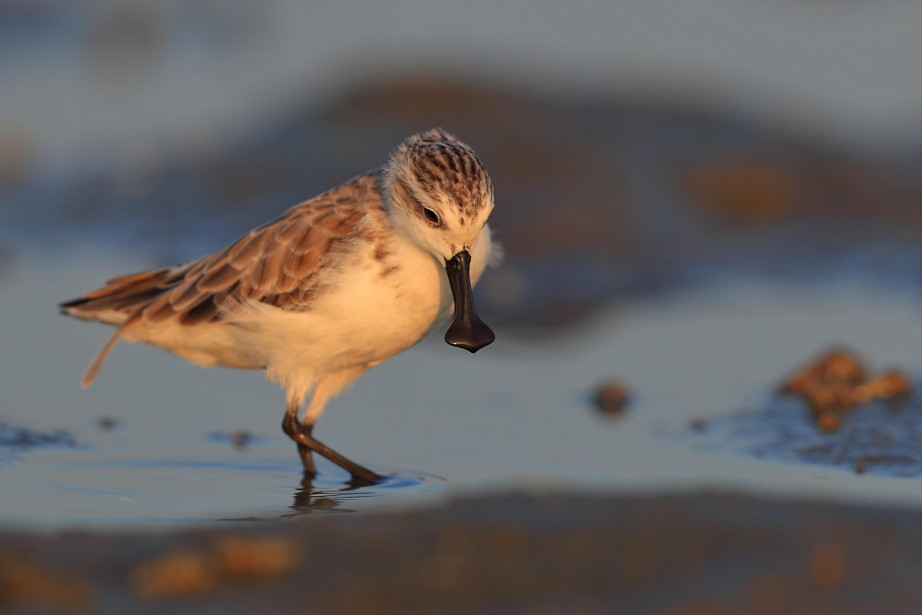 A spoon-billed sandpiper is spotted at sunset in Leizhou Bay, Zhanjiang city, south China's Guangdong Province. (Photo/Cheng Li)