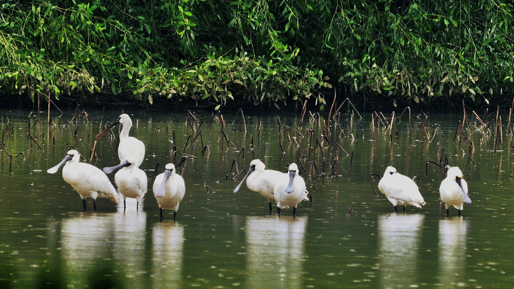 A flock of black-faced spoonbills, a species under first-class state protection in China, enjoys some leisure time at the Nansha Wetland Park in Guangzhou city, south Guangdong Province. (Photo/Chen Qingchun)
