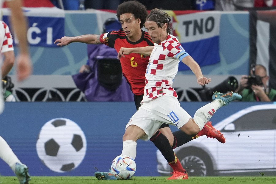 Luka Modric (R) of Croatia vies with Axel Witsel of Belgium during the Group F match between Croatia and Belgium at the 2022 FIFA World Cup at Ahmad Bin Ali Stadium in Al Rayyan, Qatar, Dec. 1, 2022. (Xinhua/Zheng Huansong)