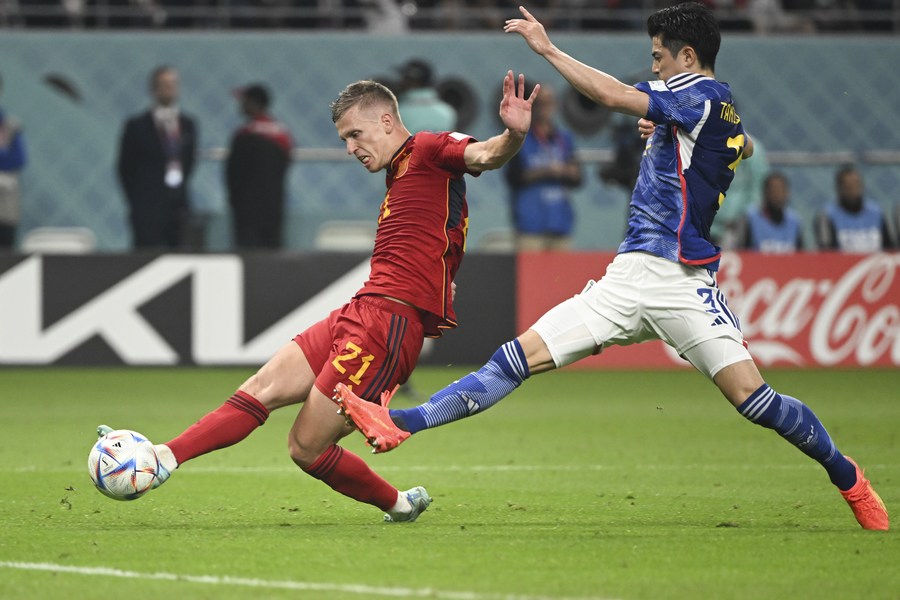 Dani Olmo of Spain vies with Taniguchi Shogo of Japan during their Group E match at the 2022 FIFA World Cup at Khalifa International Stadium in Doha, Qatar, Dec. 1, 2022. (Xinhua/Li Ga)