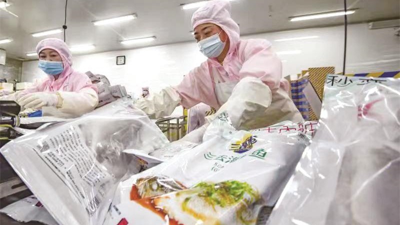 Workers pack precooked large yellow croaker dishes at an aquatic products company. (Photo/Fujian Daily)