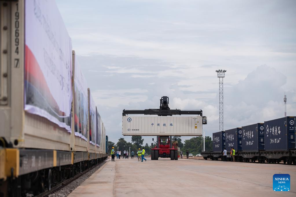 Cross-border goods are reloaded at a freight transit yard of China-Laos Railway's Vientiane South Station on July 1, 2022. (Xinhua/Kaikeo Saiyasane)