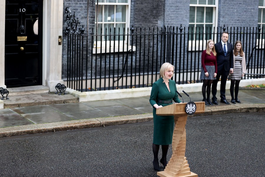 Liz Truss delivers a speech on her last day in office as Britain's prime minister outside 10 Downing Street in London, Britain, Oct. 25, 2022. Rishi Sunak became Britain's new prime minister after meeting King Charles III in Buckingham Palace, where the monarch asked him to form a government after the resignation of Liz Truss. (Xinhua/Li Ying)