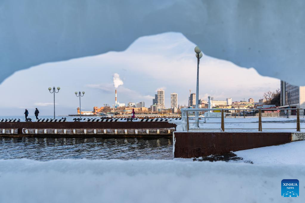 The city view is seen from the crevice of icicles in Vladivostok, Russia, Dec. 3, 2022. (Photo by Guo Feizhou/Xinhua)