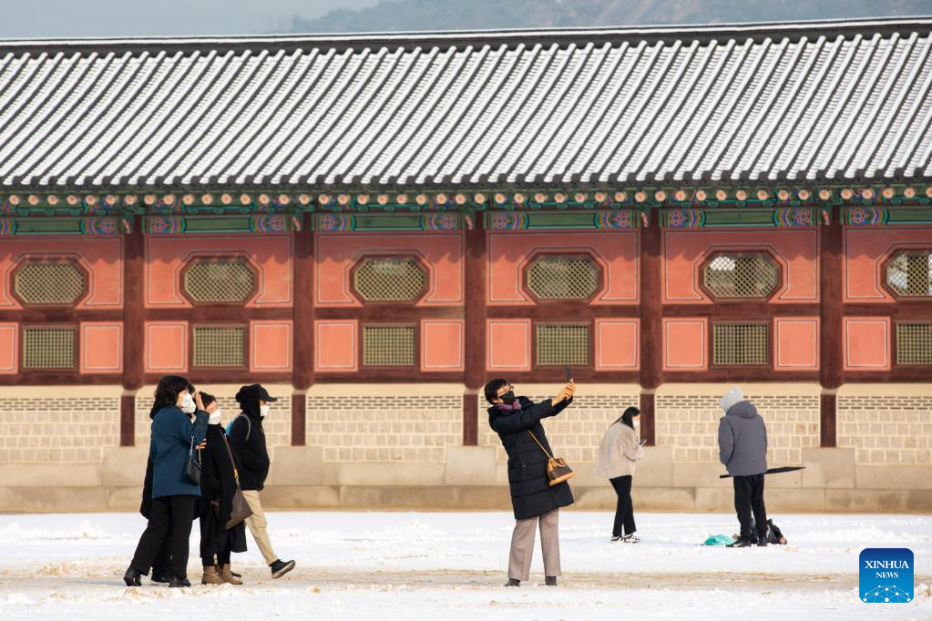 Tourists take photos at the Gyeongbokgung Palace in snow in Seoul, South Korea, Dec. 3, 2022. (Xinhua/Wang Yiliang)