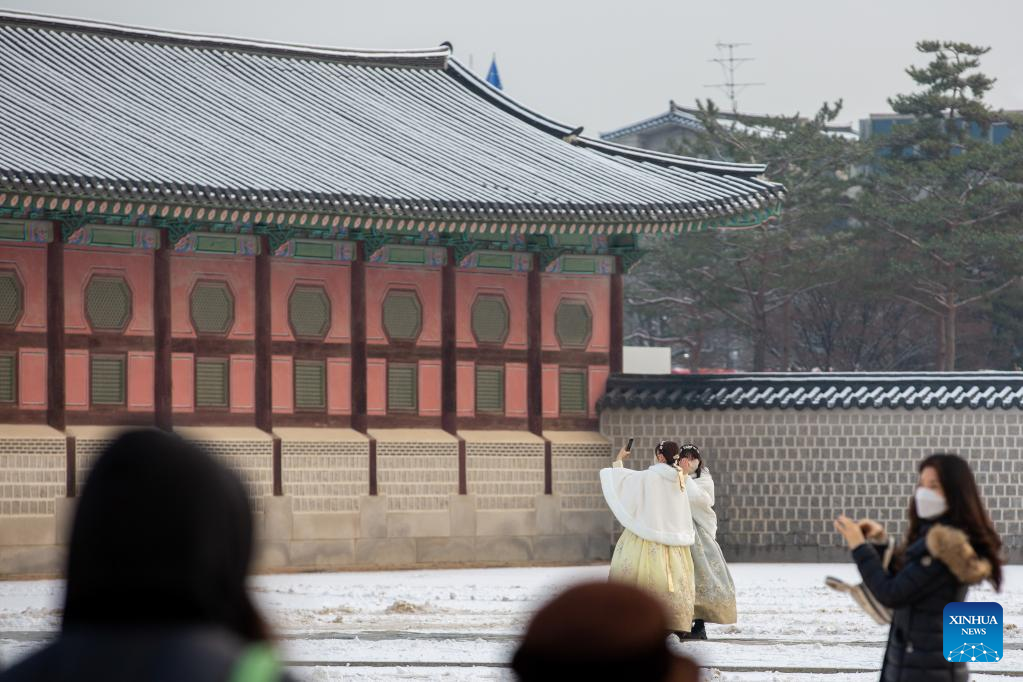 Tourists take photos at the Gyeongbokgung Palace in snow in Seoul, South Korea, Dec. 3, 2022. (Xinhua/Wang Yiliang)