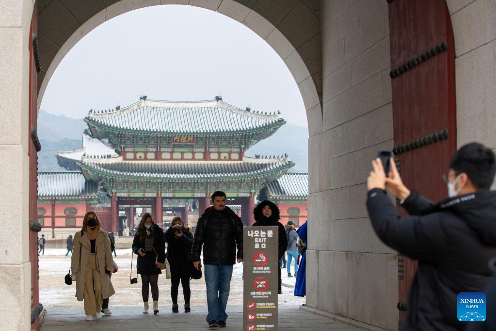 Tourists visit the Gyeongbokgung Palace in snow in Seoul, South Korea, Dec. 3, 2022. (Xinhua/Wang Yiliang)