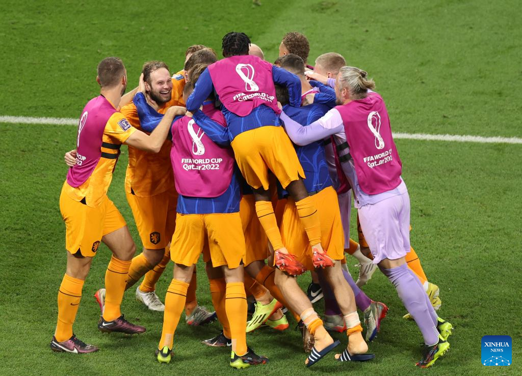 Players of the Netherlands celebrate after the Round of 16 match between the Netherlands and the United States at the 2022 FIFA World Cup at Khalifa International Stadium in Doha, Qatar, Dec. 3, 2022. (Xinhua/Jia Haocheng)