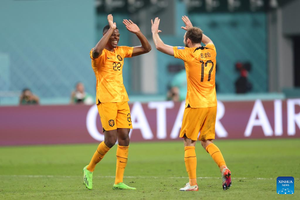 Denzel Dumfries (L) of the Netherlands celebrates with Daley Blind after scoring team's third goal during the Round of 16 match between the Netherlands and the United States at the 2022 FIFA World Cup at Khalifa International Stadium in Doha, Qatar, Dec. 3, 2022. (Xinhua/Li Ming)