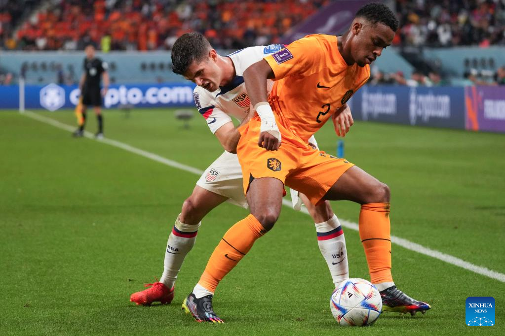 Jurrien Timber (R) of the Netherlands vies with Christian Pulisic of the United States during their Round of 16 match at the 2022 FIFA World Cup at Khalifa International Stadium in Doha, Qatar, Dec. 3, 2022. (Xinhua/Li Gang)