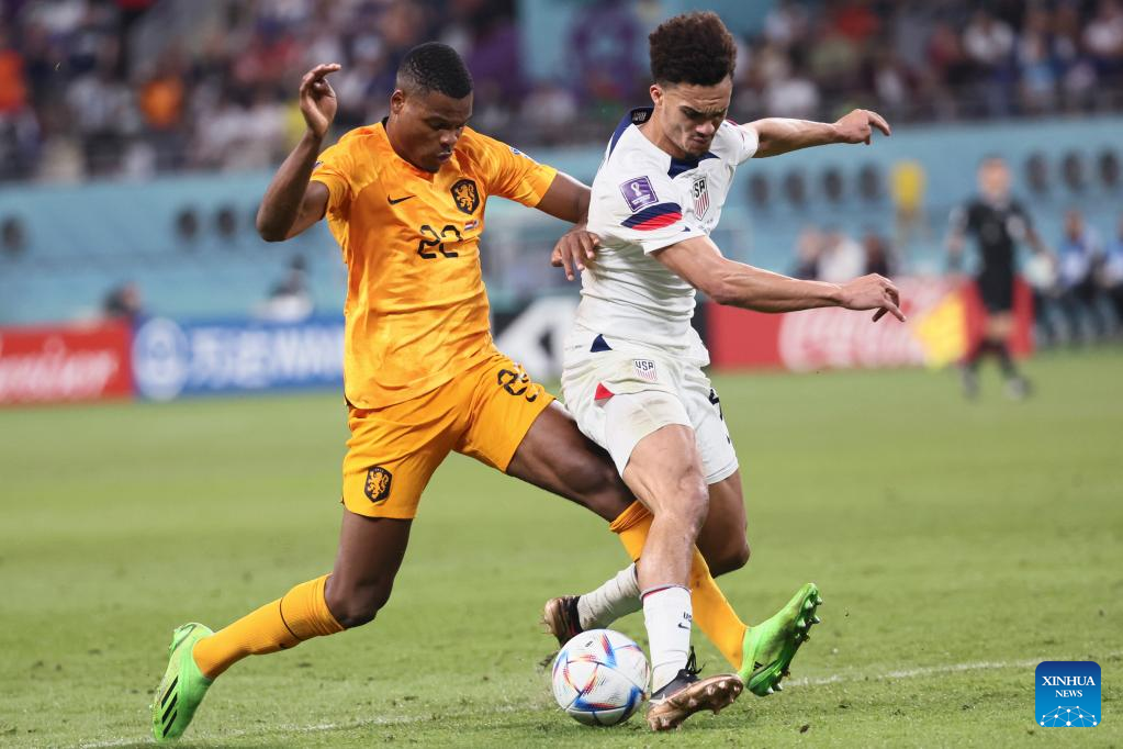 Denzel Dumfries (L) of the Netherlands vies with Antonee Robinson of the United States during their Round of 16 match at the 2022 FIFA World Cup at Khalifa International Stadium in Doha, Qatar, Dec. 3, 2022. (Xinhua/Lan Hongguang)