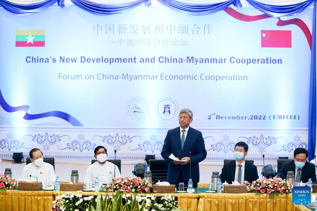 Chinese Ambassador to Myanmar Chen Hai speaks at a forum on China-Myanmar economic cooperation in Yangon, Myanmar, Dec. 2, 2022. (Photo by Myo Kyaw Soe/Xinhua)