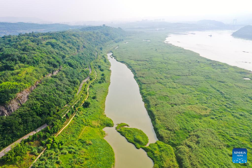 This aerial photo taken on June 20, 2022 shows flood-tolerant plants on Guangyang Isle in southwest China's Chongqing. (Xinhua/Wang Quanchao)
