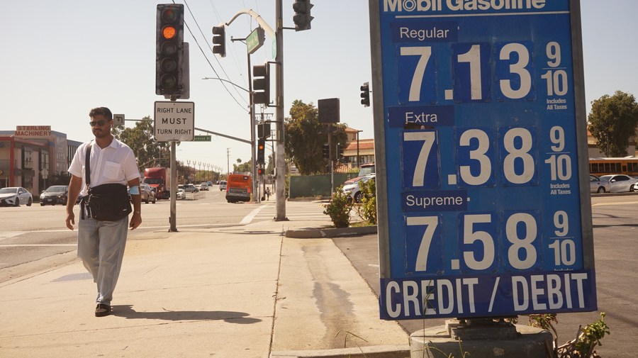 A price board shows gasoline prices at a gas station in Los Angeles County, California, the United States, Oct. 3, 2022. (Photo by Zeng Hui/Xinhua)