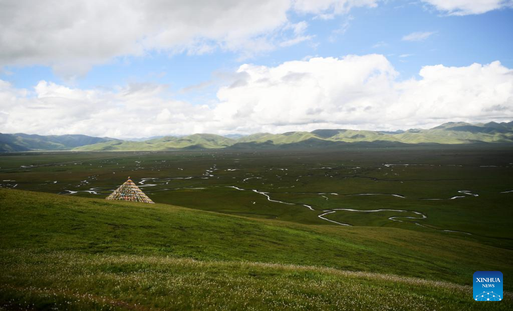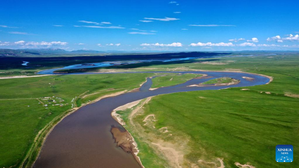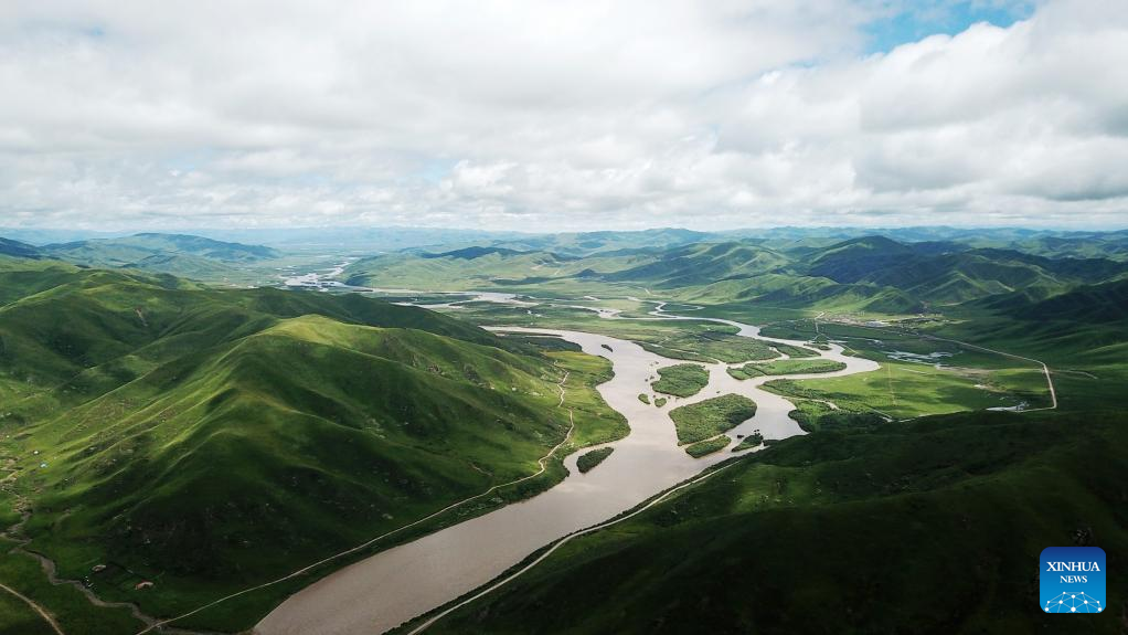 This aerial photo taken on July 13, 2021 shows the view of a restored grassland by the Yellow River in Maqu County, Gannan Tibetan Autonomous Prefecture of northwest China's Gansu Province. (Xinhua/Chen Bin)
