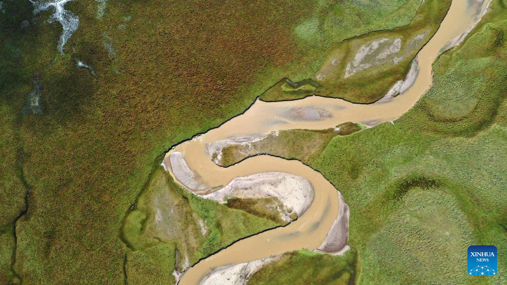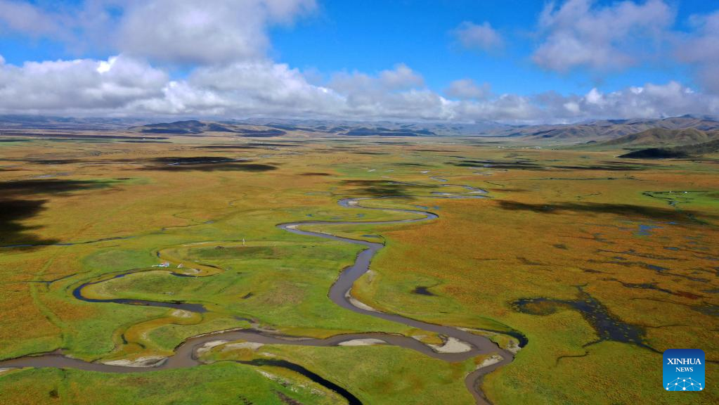 This aerial photo taken on Sept. 21, 2022 shows a view of Awancang Wetland in Maqu County, Gannan Tibetan Autonomous Prefecture of northwest China's Gansu Province. (Xinhua/Chen Bin)