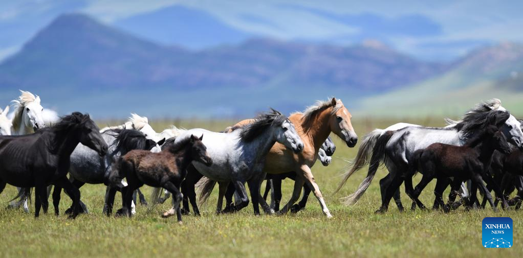 A herd of Hequ horses gallop on a ranch in Maqu County, Gannan Tibetan Autonomous Prefecture of northwest China's Gansu Province, July 15, 2021. (Xinhua/Chen Bin)
