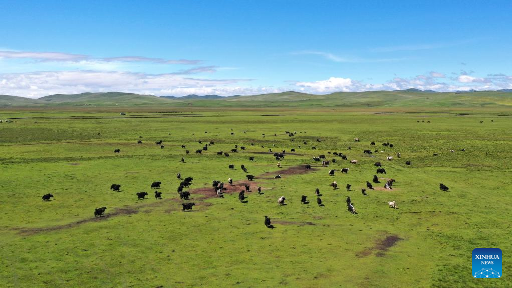 A herd of yak gallop and forage on a grassland in Maqu County, Gannan Tibetan Autonomous Prefecture of northwest China's Gansu Province, July 15, 2021. (Xinhua/Chen Bin)