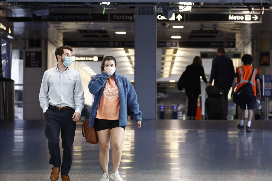 Travelers walk through terminals at Ronald Reagan Washington National Airport in Arlington, Virginia, the United States, April 14, 2022. (Photo by Ting Shen/Xinhua)