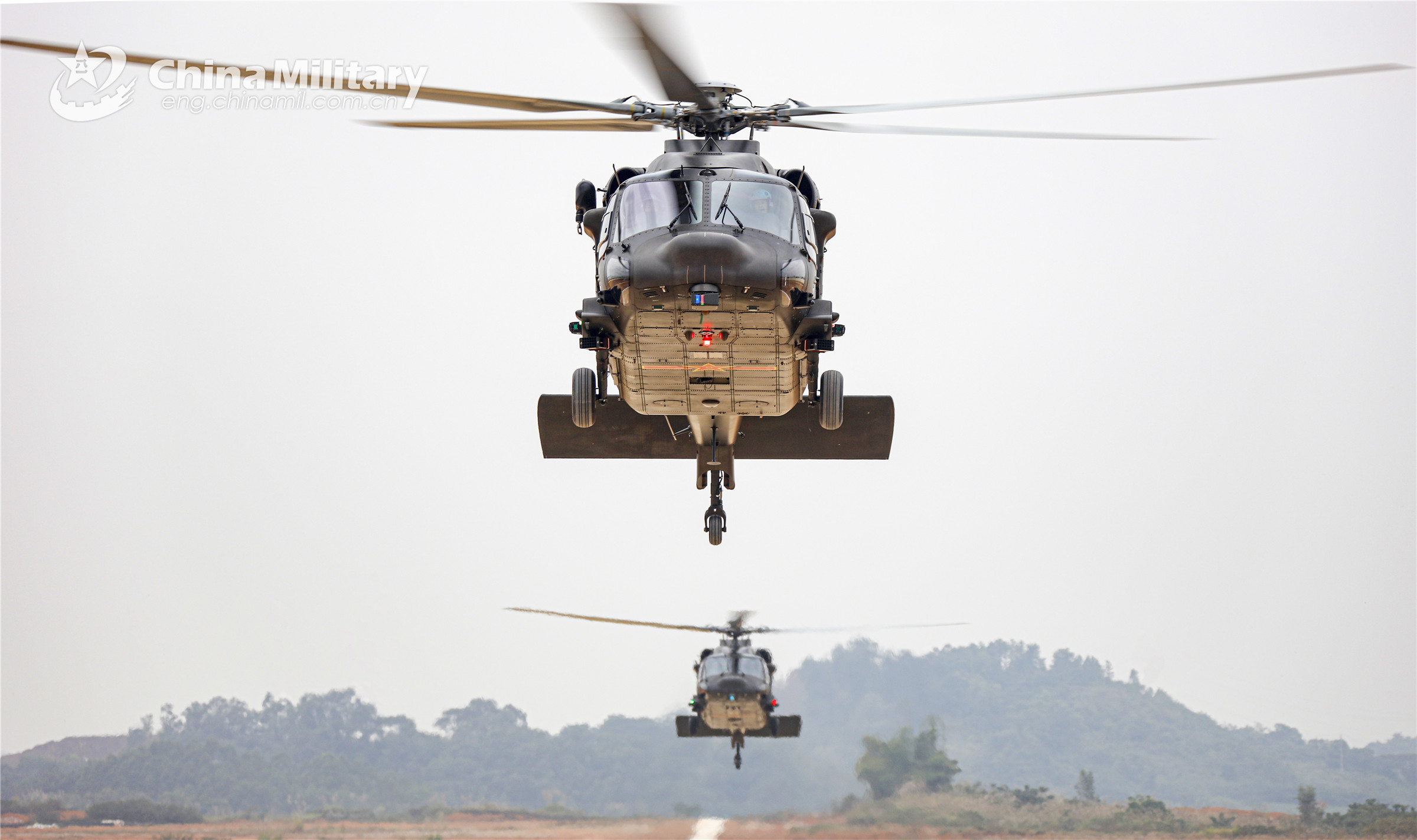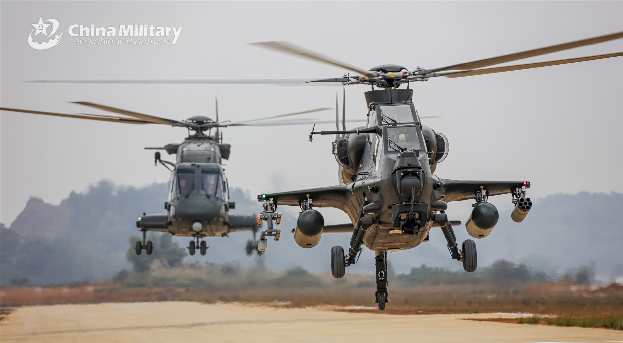 Multiple types of helicopters attached to an aviation brigade of the army lift off in turn for a flight training exercise on November 22, 2022. (eng.chinamil.com.cn/Photo by Li Chunguo)