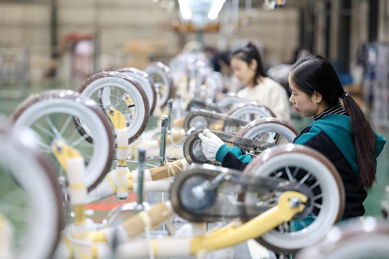 Workers assemble children's bicycles to be exported in a factory in Pingxiang county, Xingtai, north China's Hebei province, Oct. 26, 2022. (People's Daily Online/Chai Gengli)