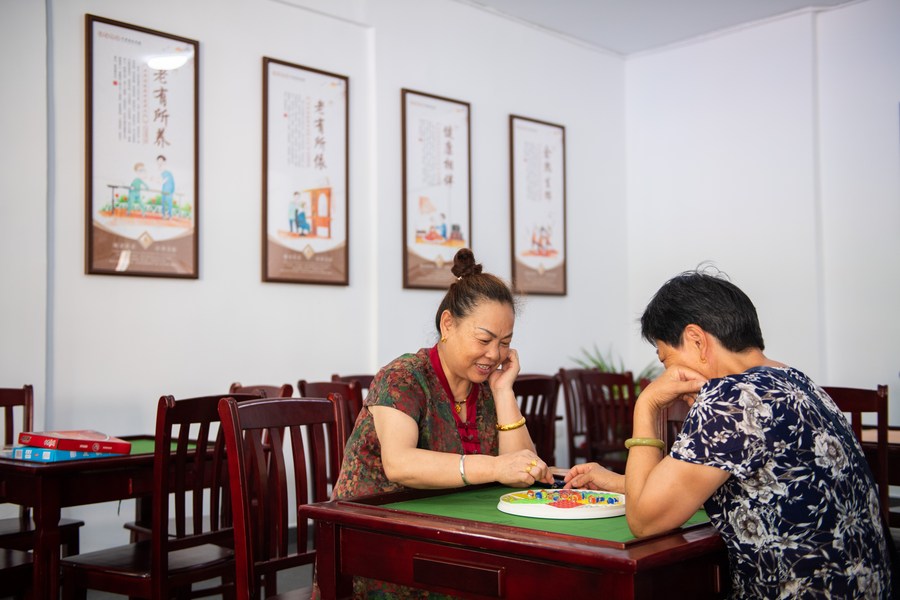Senior citizens play Chinese checkers at a community-based day-care center in Hanshou County, central China's Hunan Province, July 20, 2022. (Xinhua/Chen Sihan)