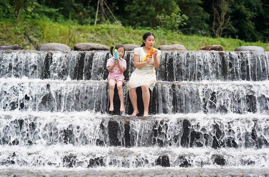 Children play with water guns in Sanping Village of Zhongyuan Town in Jing'an County, east China's Jiangxi Province, July 27, 2022. (Xinhua/Wan Xiang)