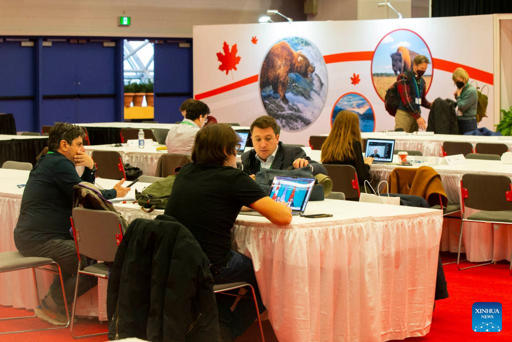 Media members work at a media center of the second part of the 15th meeting of the Conference of the Parties (COP15) to the UN Convention on Biological Diversity (CBD) in Montreal, Canada, on Dec. 6, 2022. (Photo by Zou Zheng/Xinhua)