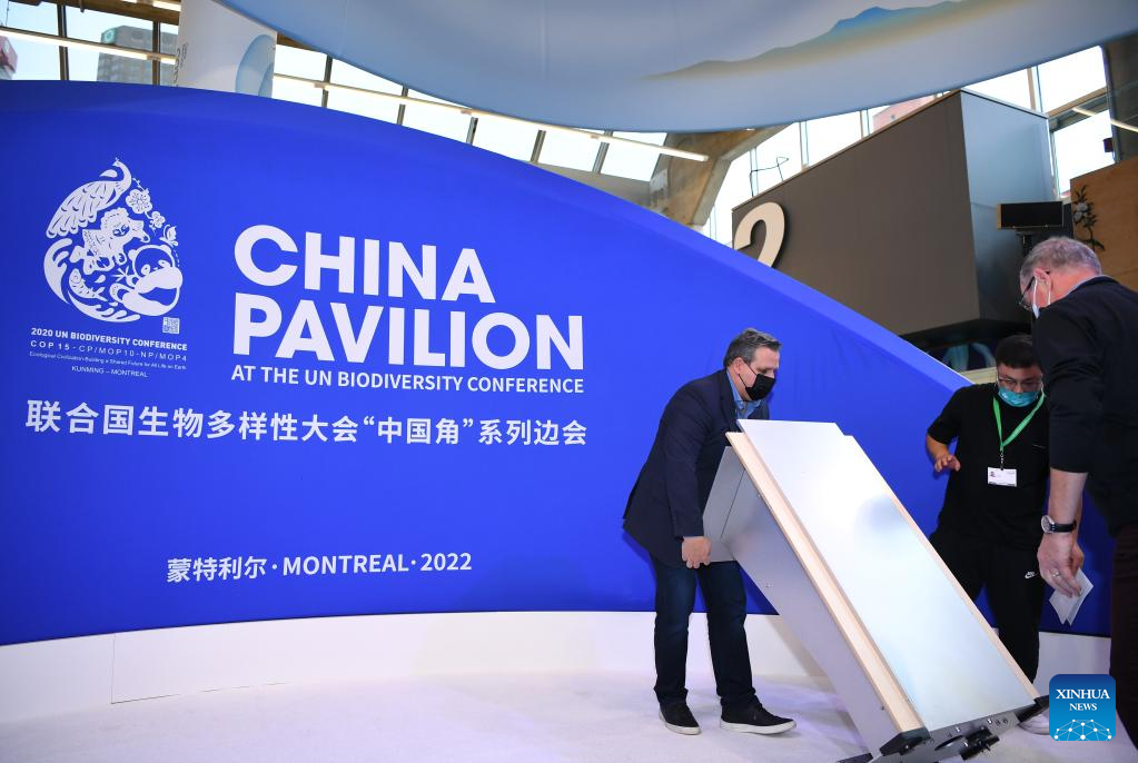 People prepare for the China Pavilion at Montreal Convention Center in Montreal, Canada, on Dec. 6, 2022. (Xinhua/Ren Pengfei)