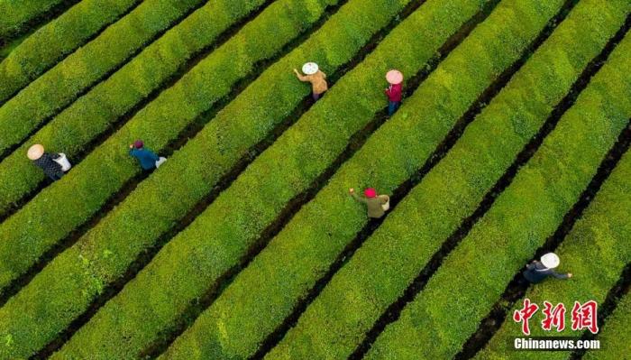An aerial photo shows farmers picking tea leaves at an organic tea garden in east China’s Jiangxi Province. (Photo/Zhao Chunliang)