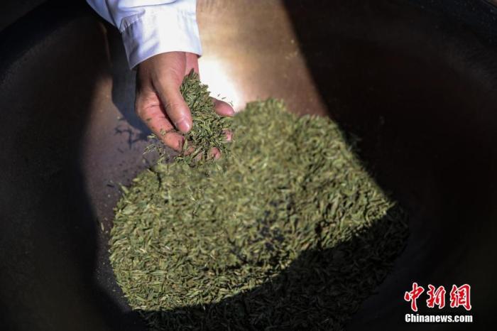 A man fries tea leaves in southwest China’s Guizhou Province. (China News Service/Qu Honglun)