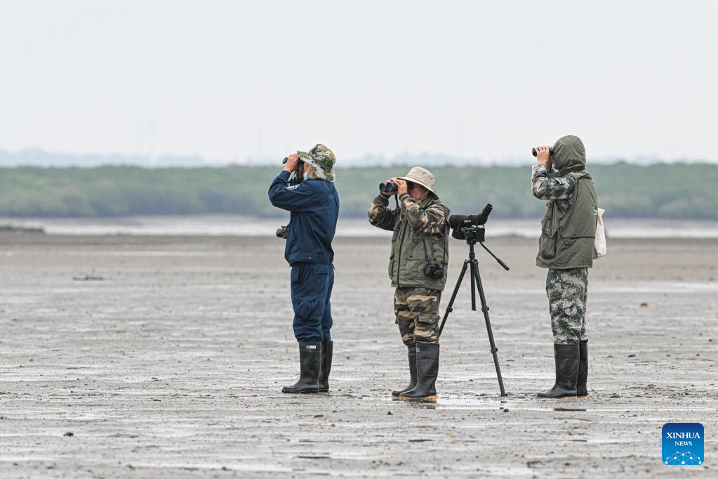 People observe birds at a wetland of Danzhou, south China's Hainan Province, Dec. 5, 2022. (Xinhua/Pu Xiaoxu)
