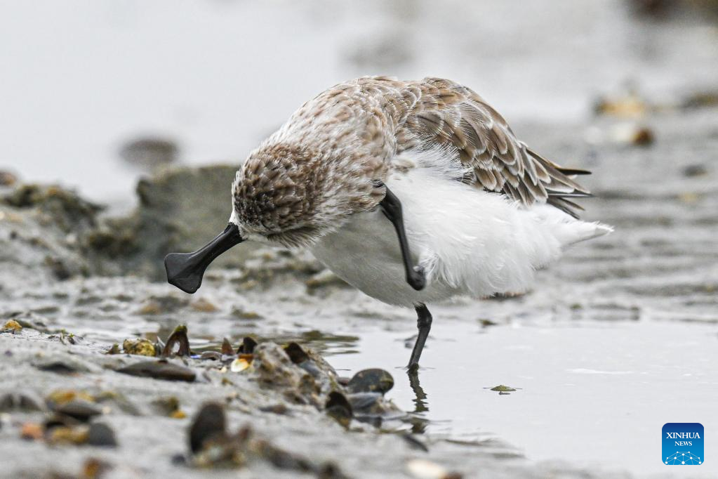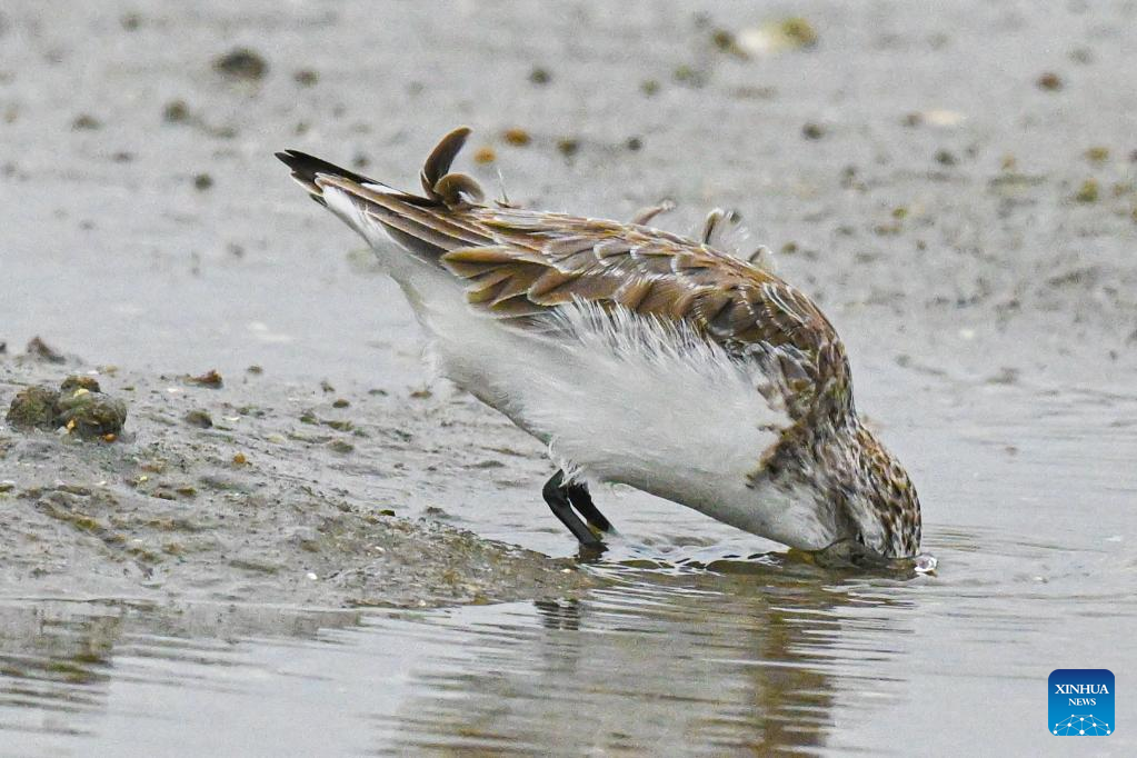 A spoon-billed sandpiper forages at a wetland of Danzhou, south China's Hainan Province, Dec. 5, 2022. (Xinhua/Pu Xiaoxu)