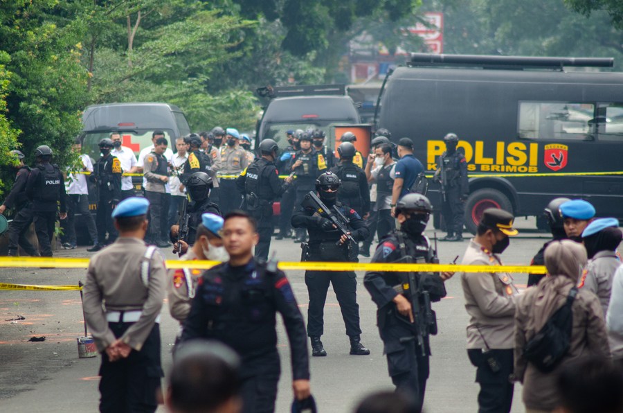 Police officers stand guard near the police station hit by suicide bombing in Bandung, Indonesia, Dec. 7, 2022. (Photo by Septianjar Muharam/Xinhua)