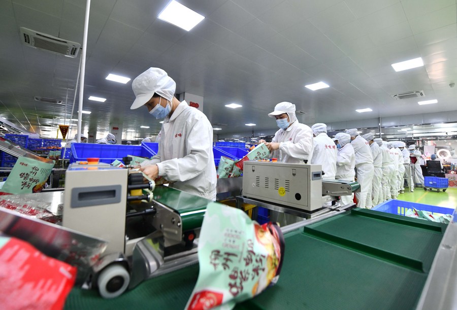 Workers pack Luosifen rice noodles at a food-processing company in Liuzhou, south China's Guangxi Zhuang Autonomous Region, Nov. 23, 2021. (Xinhua/Huang Xiaobang)