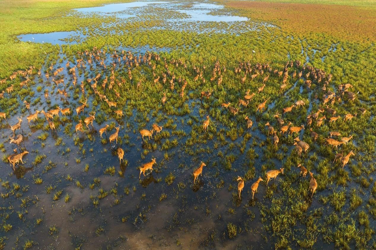 Elks run on a piece of land in a national nature reserve in Yancheng, east China's Jiangsu province, Oct. 18, 2022. (People's Daily Online/Zhang Kaifeng)