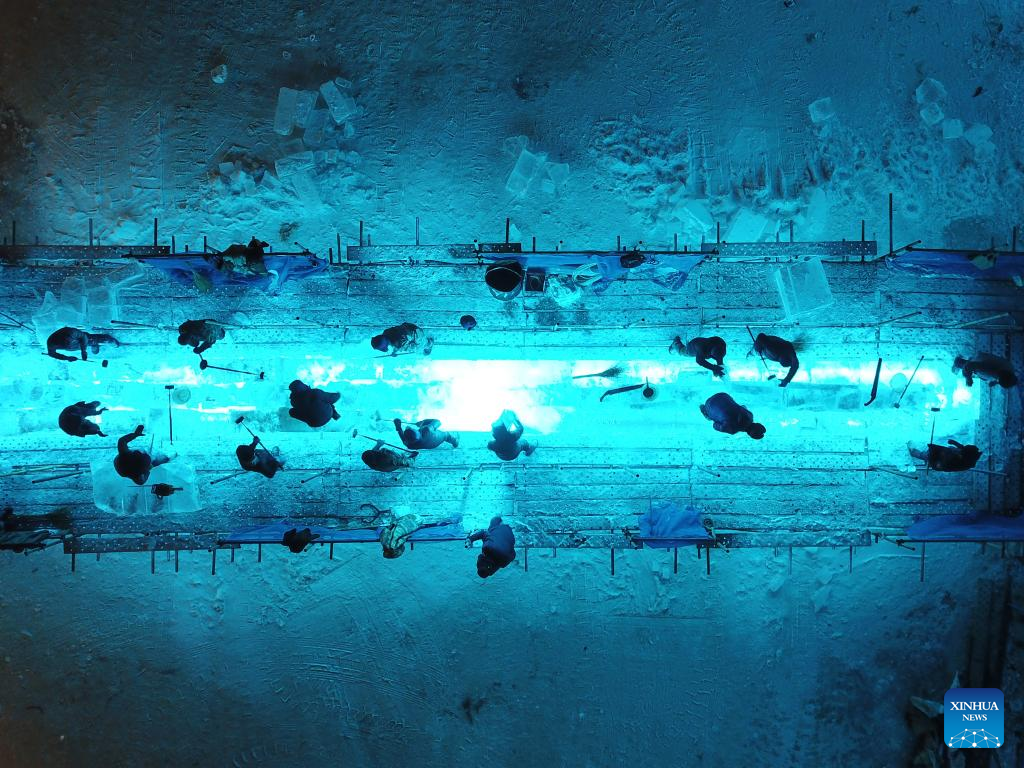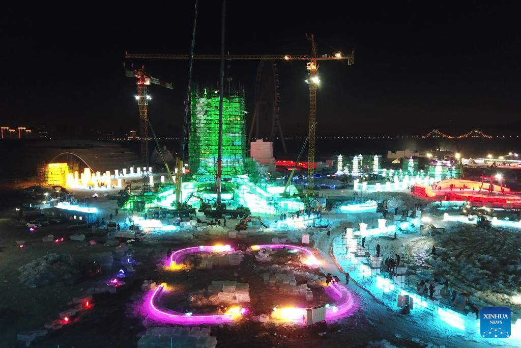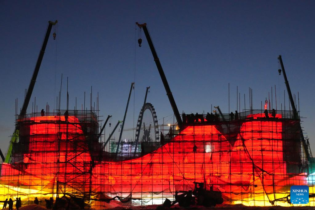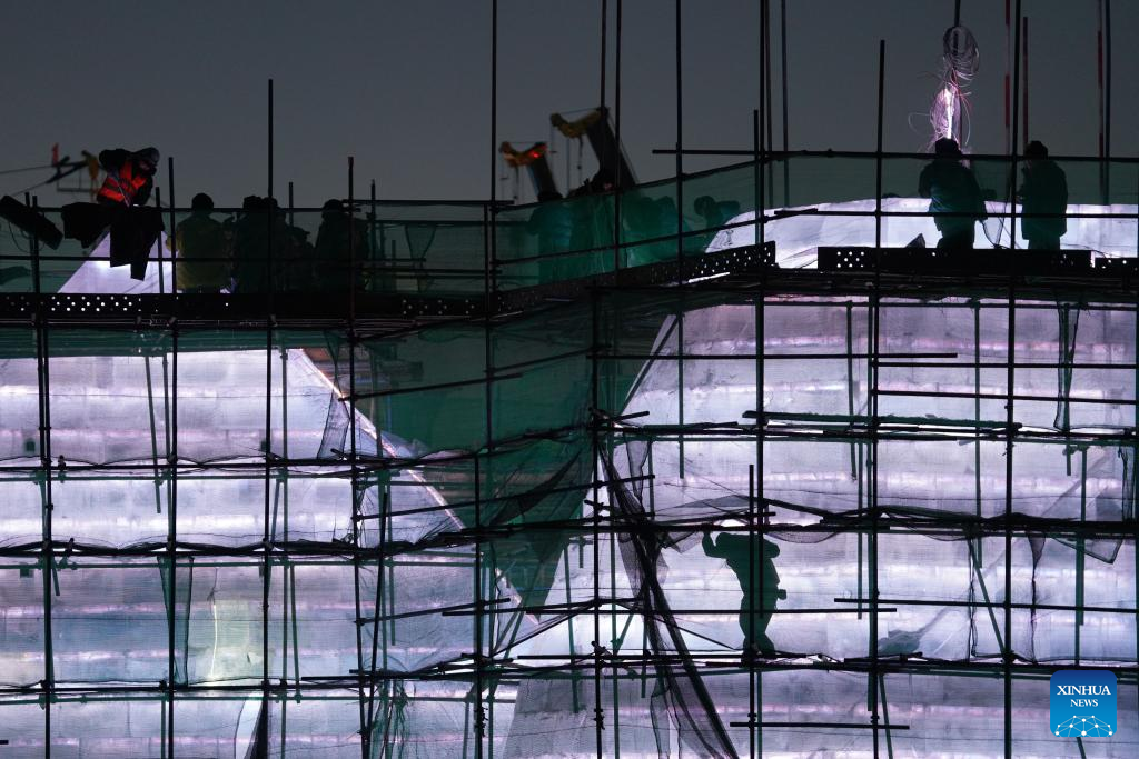 Workers are seen at the construction site of the Harbin Ice-Snow World, a renowned seasonal theme park opening every winter, in Harbin, northeast China's Heilongjiang Province, Dec. 7, 2022. (Xinhua/Wang Jianwei)