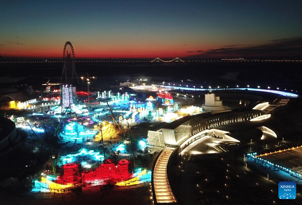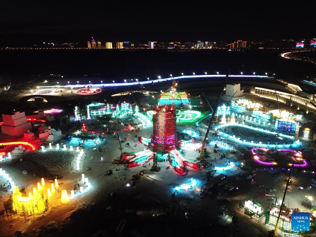 This aerial photo taken on Dec. 7, 2022 shows workers working at the construction site of the Harbin Ice-Snow World, a renowned seasonal theme park opening every winter, in Harbin, northeast China's Heilongjiang Province. (Xinhua/Wang Jianwei)