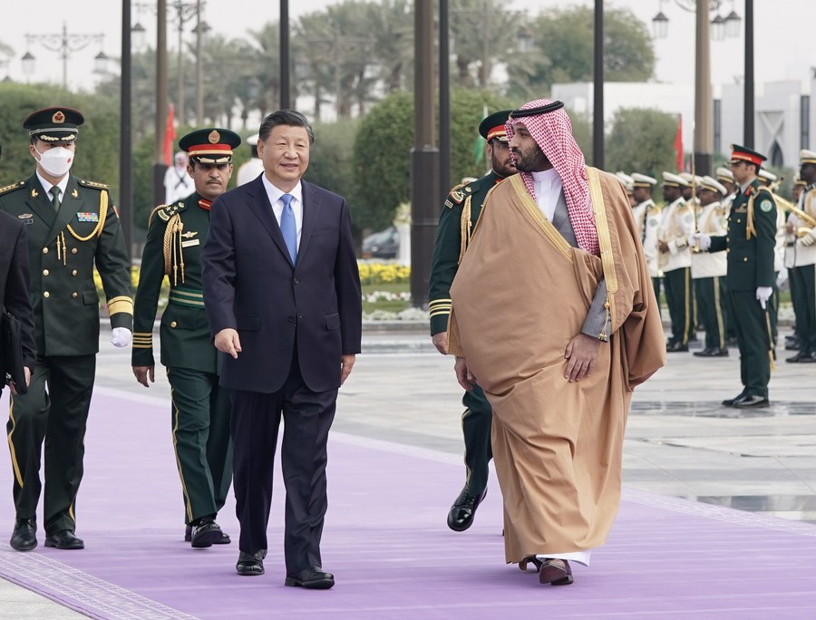 Chinese President Xi Jinping, who is paying a state visit to Saudi Arabia, attends a welcoming ceremony held by Saudi Crown Prince and Prime Minister Mohammed bin Salman Al Saud on behalf of King Salman bin Abdulaziz Al Saud at the royal palace in Riyadh, Saudi Arabia, Dec. 8, 2022. (Xinhua/Xie Huanchi)