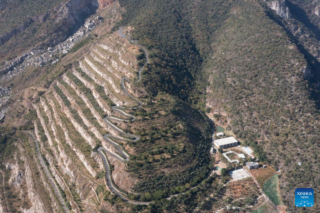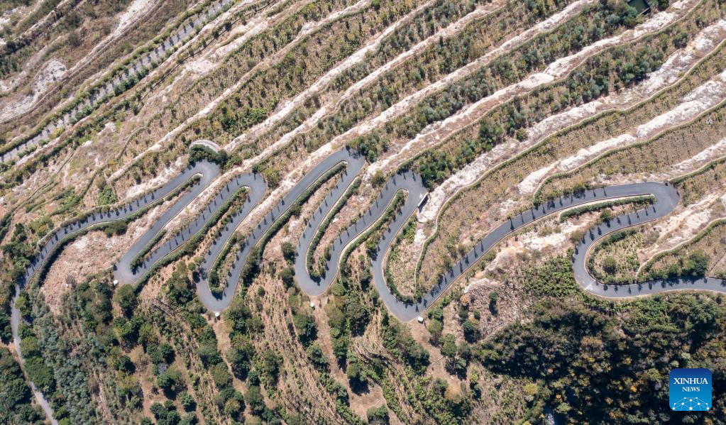 This aerial photo shows a paved road in a mining site after ecological restoration in a cycad national nature reserve in Panzhihua, southwest China's Sichuan Province, Nov. 28, 2022. (Xinhua/Xu Bingjie)