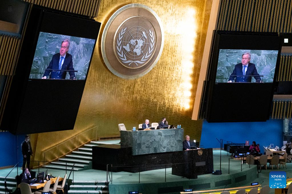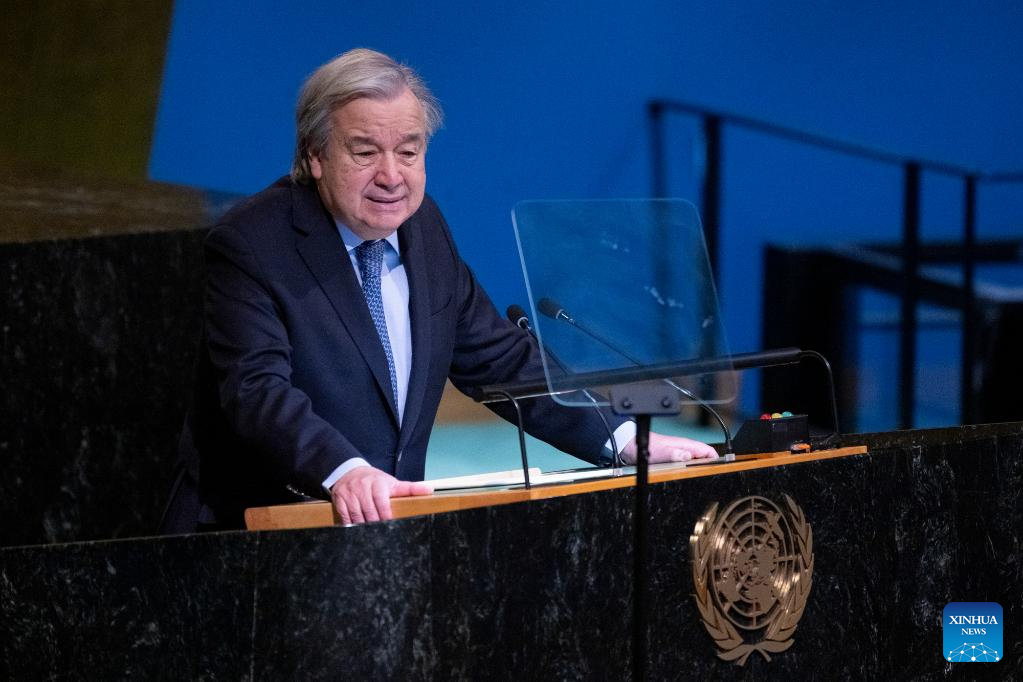 UN Secretary-General Antonio Guterres addresses a General Assembly meeting commemorating the 40th anniversary of the adoption and opening for signature of the UN Convention on the Law of the Sea, at the UN headquarters in New York, on Dec. 8, 2022. (Eskinder Debebe/UN Photo/Handout via Xinhua)