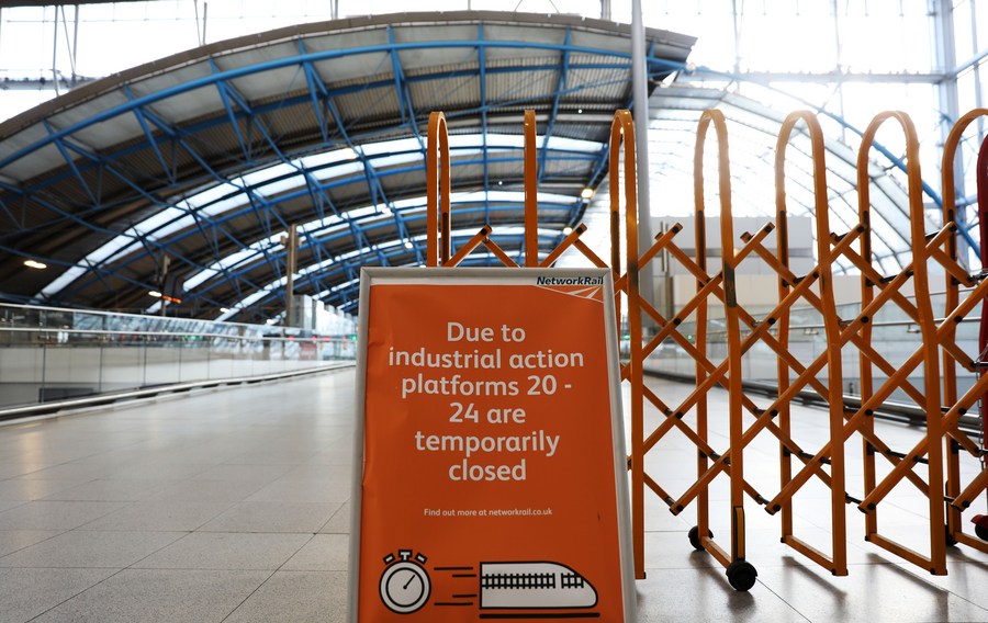 LONDON, Dec. 8 (Xinhua) -- The wave of strikes over pay that has hit the United Kingdom (UK) since the early days of December appears to continue unabated, and the labor actions now also threaten traffic at the country's airports and railway stations. Public discontent is on the rise.
