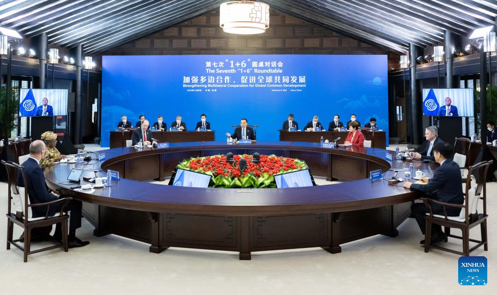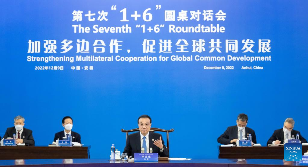 Chinese Premier Li Keqiang speaks during the seventh "1+6" Roundtable with President David Malpass of the World Bank Group, Managing Director Kristalina Georgieva of the International Monetary Fund, Director-General Ngozi Okonjo-Iweala of the World Trade Organization, Director-General Gilbert F. Houngbo of the International Labor Organization, Secretary-General Mathias Cormann of the Organization for Economic Cooperation and Development, and Chairman Klaas Knot of the Financial Stability Board, in Huangshan City, east China's Anhui Province, Dec. 9, 2022. (Xinhua/Zhai Jianlan)